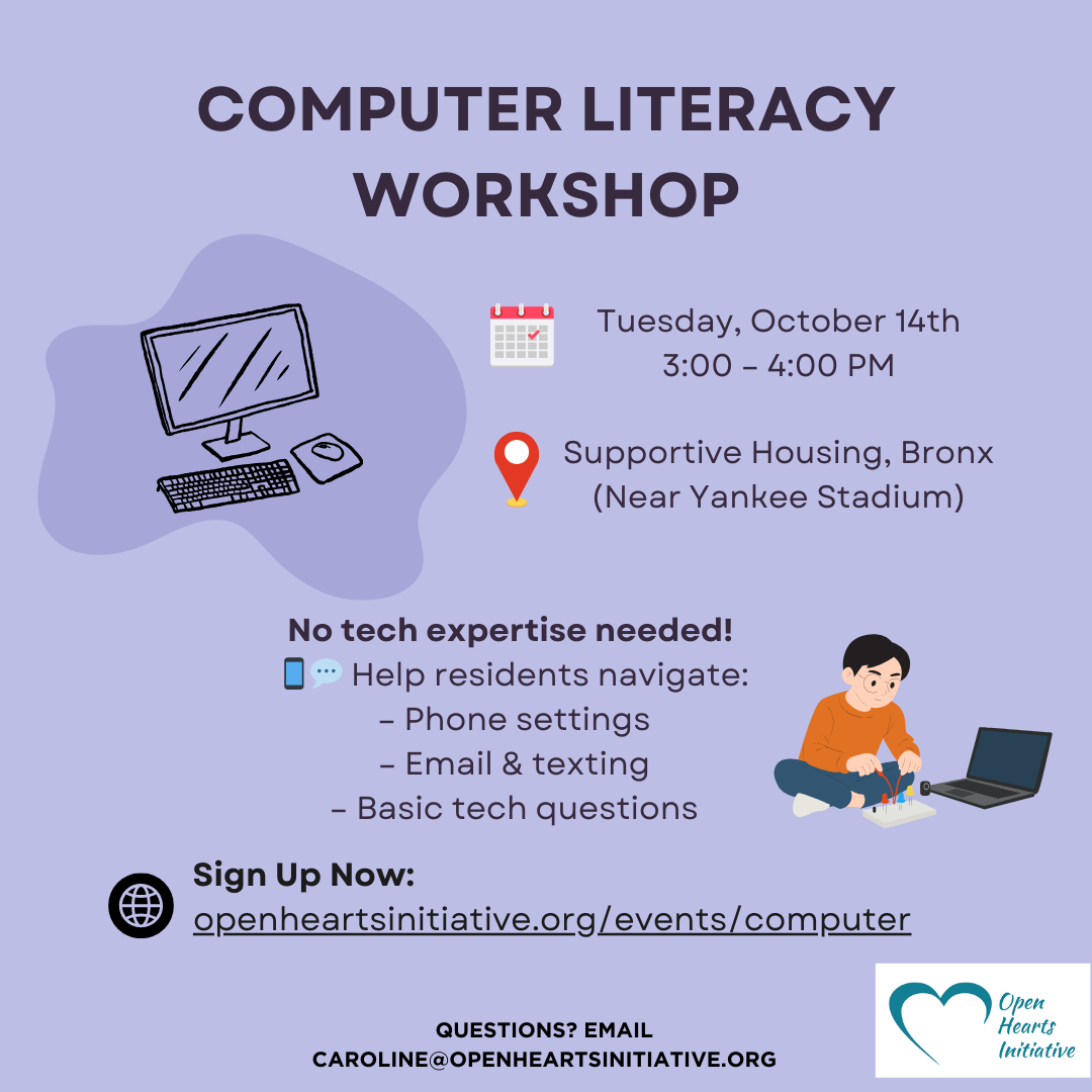 We are in need of a few more volunteers to help lead monthly computer literacy workshops at a supportive housing site in the Bronx! Support neighbors as they learn about internet basics, email/portal access, and how to recognize scams. No special expertise is required, just comfort with computer basics.