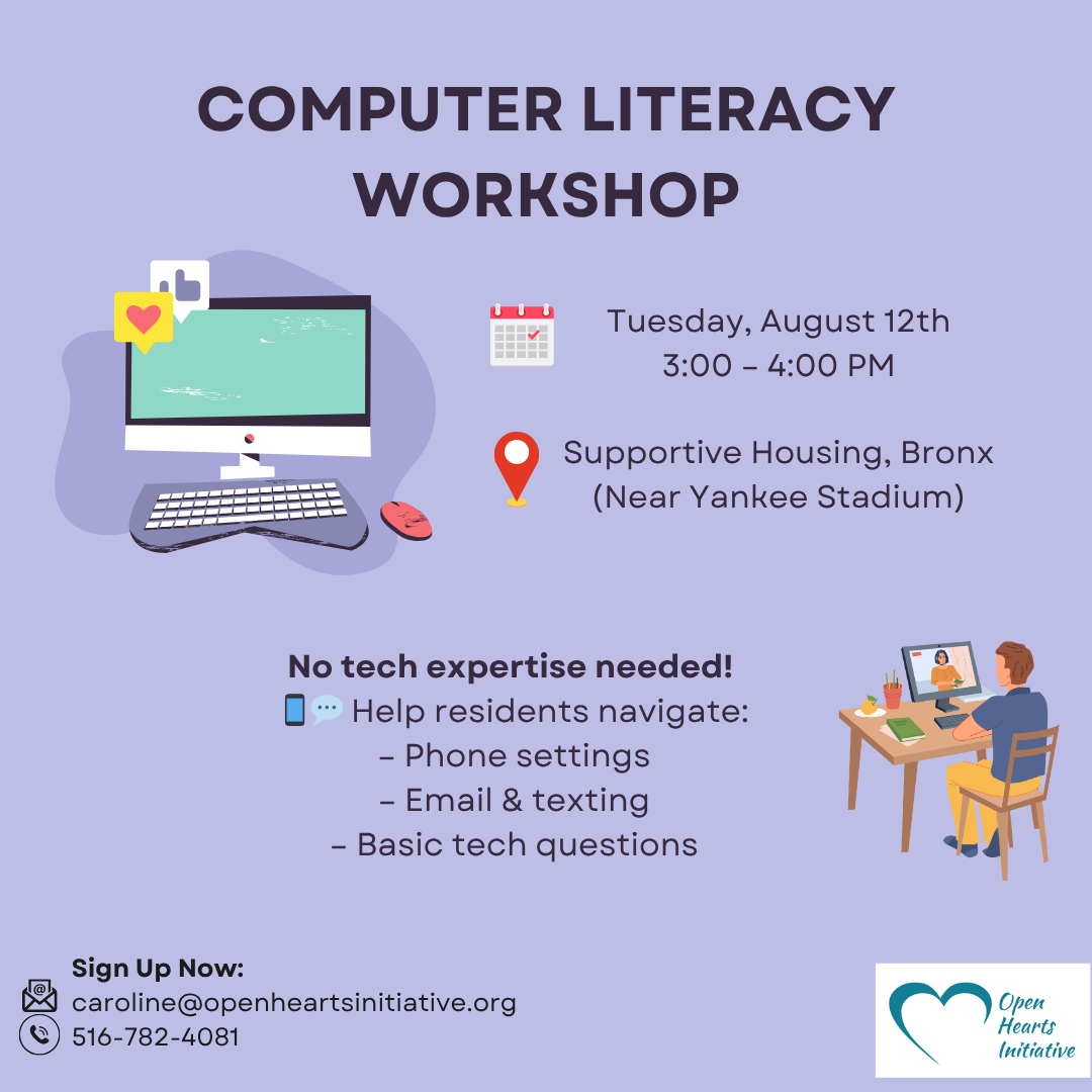 We are in need of a few more volunteers to help lead monthly computer literacy workshops at a supportive housing site in the Bronx! Support neighbors as they learn about internet basics, email/portal access, and how to recognize scams. No special expertise is required, just comfort with computer basics.