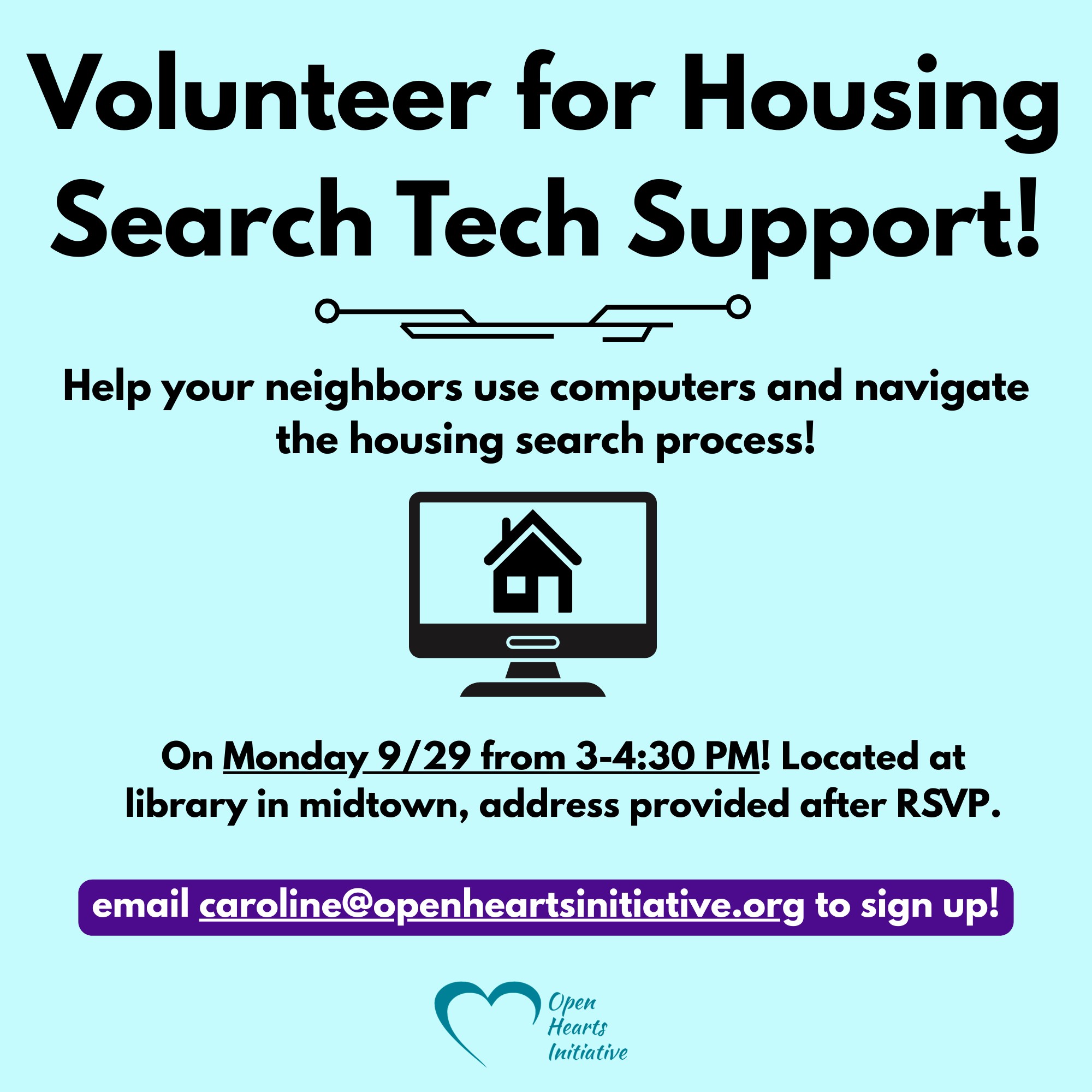 Join us on 9/29 from 3-4:30 PM at a library in Midtown East to help neighbors work through the housing search process! A brief training will be provided. Volunteers will work one on one with shelter residents as they navigate making accounts, uploading documents, applying for housing, and finding housing websites! RSVP using the button below (location upon RSVP).