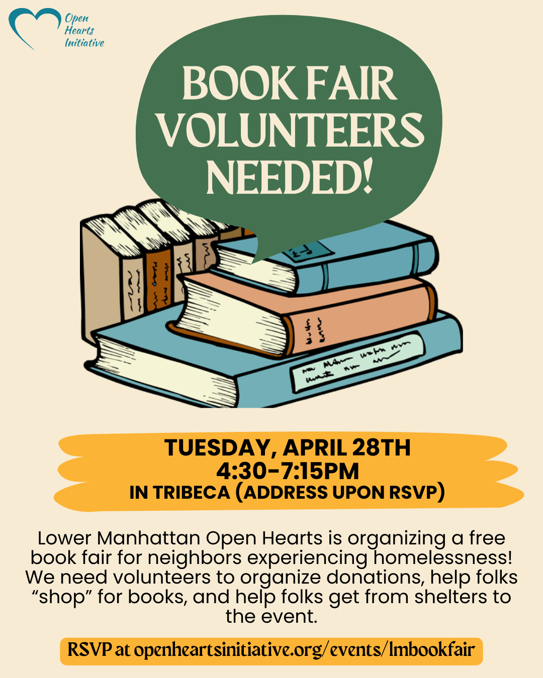 Lower Manhattan Open Hearts is organizing a free book fair in Tribeca for neighbors experiencing homelessness!