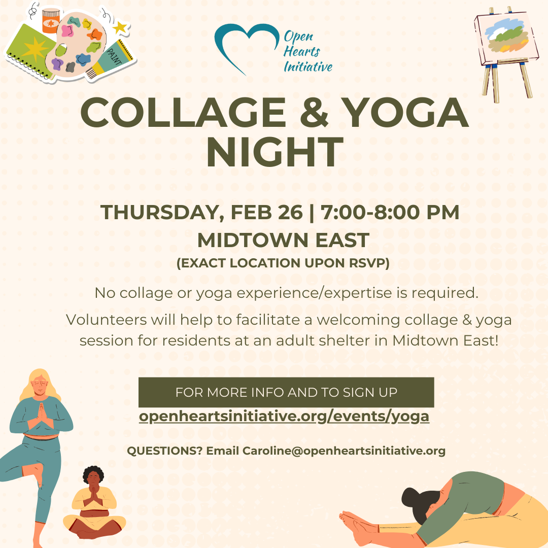 Back to All Events Yoga and Art in Midtown! Thursday, February 26, 2026 7:00 PM 8:00 PM Google Calendar ICS Join us at a shelter in Midtown East for an evening of yoga, collaging and getting to know your neighbors! Supplies and snacks will be provided. Specific location upon RSVP. (RSVP below!) RSVP